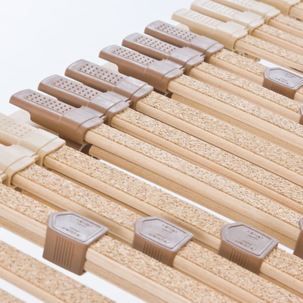 • Alle Verstellmöglichkeiten erfolgen über eine metallfreie Holzrasterung. Die Leistenauflage aus echtem Kork schont den Bezug der Matratze und verhindert, dass sie rutscht